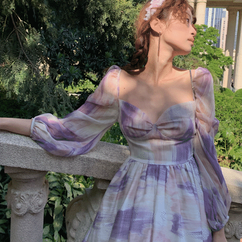 [여름신상/미니드레스]스뭬어넥 리본 가슴 오로라 미니원피스 타이다이 나염 등트임 쉬폰원피스 a라인 버블스커트 해변 여행 휴가 보라 핑크 요정 숏원피스 20대