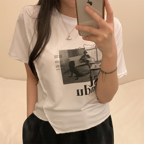 [크롭반팔/크롭티] 사선 언발 프린팅 라운드넥 크롭 반팔티 (2color)