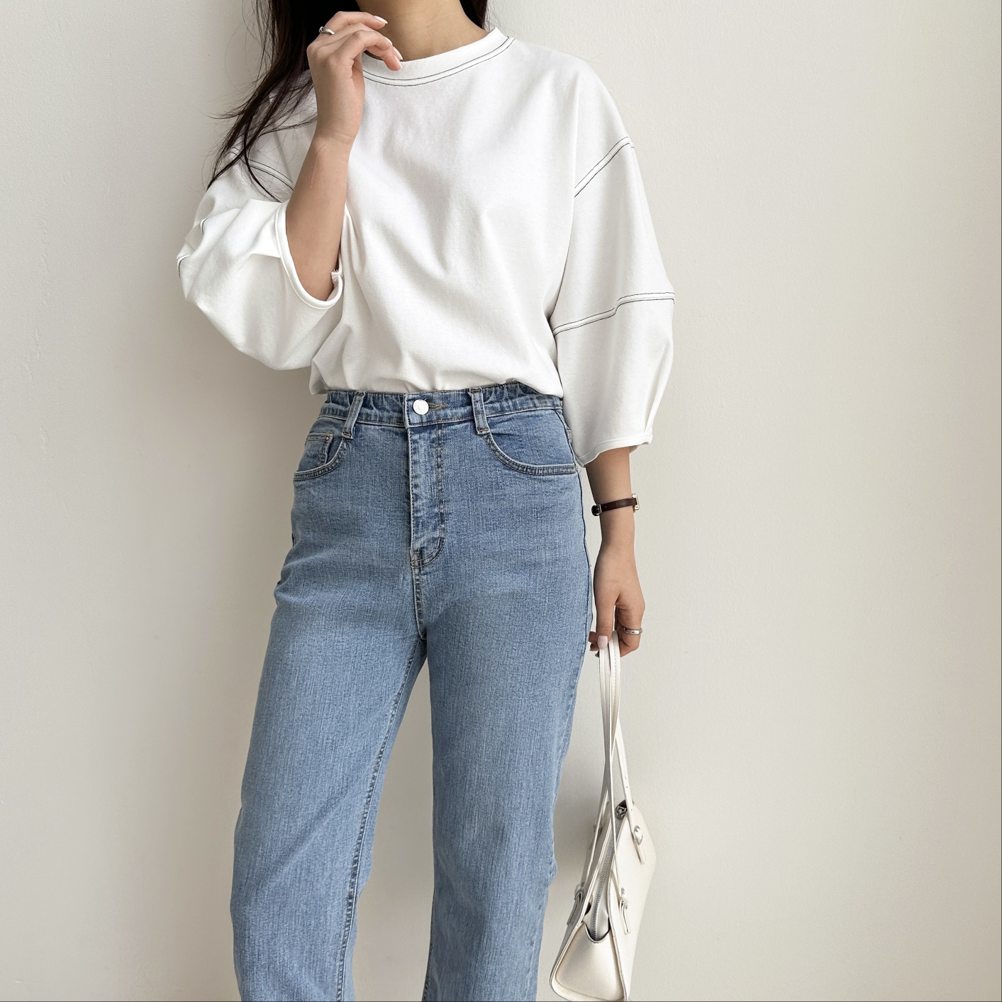 벌룬 퍼프 소매 7부 스티치 티셔
