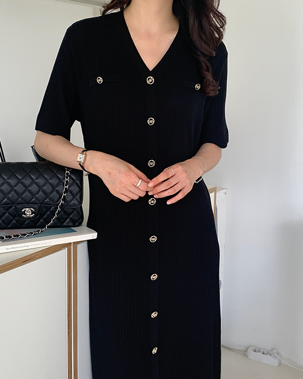 🌴[하객원피스/롱원피스][여름원피스/니트원피스] 브이넥 골드단추 니트 롱 원피스 루즈핏 2029
