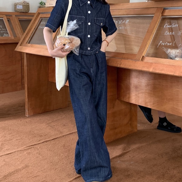 (코디세트)데님 반팔 셔츠+와이드 팬츠 세트 A37806