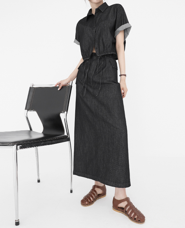 [자체제작/4천장] 케이 생지 반팔셔츠 카고 롱스커트 데님셋업 (1color)