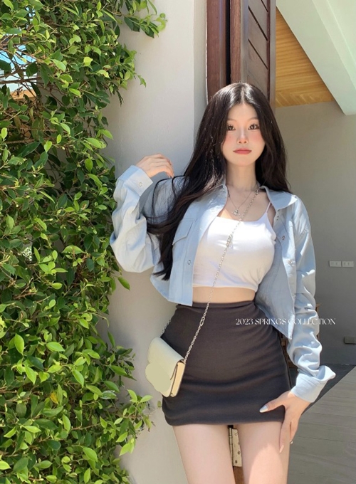 스위트 상의 여리핏 여자 친구룩 셔츠 긴소매 탑 포켓 있는 짧은 셔츠 루즈핏 크롭기장 패션 스커트 매칭 슈트 여성 쓰리피스 짧은치마 셋업