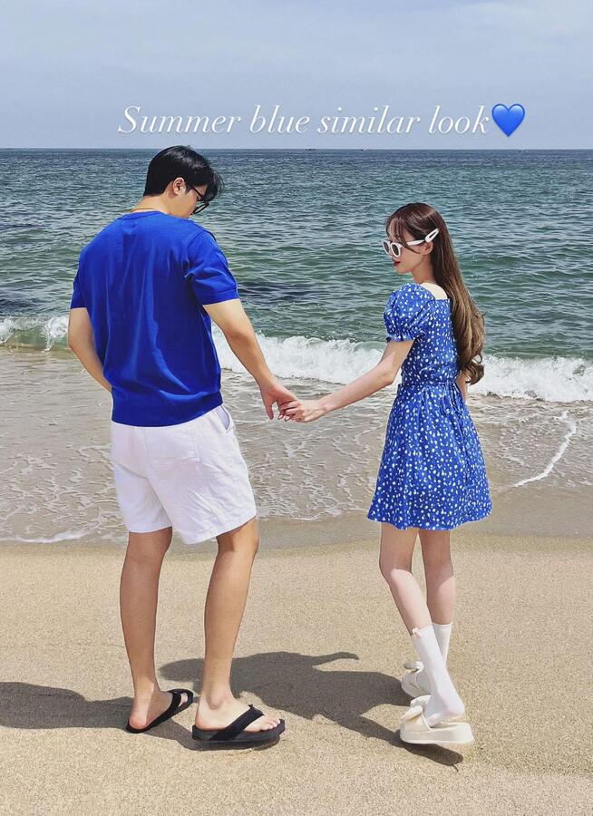 *단독[여름 시밀러룩]고퀄 블루 남녀공용 여름 쿨 반팔 니트 티셔츠 여자 플라워 미니 원피스 오프숄더 커플룩 시밀러룩 휴양지 휴가룩 바다 데이트룩