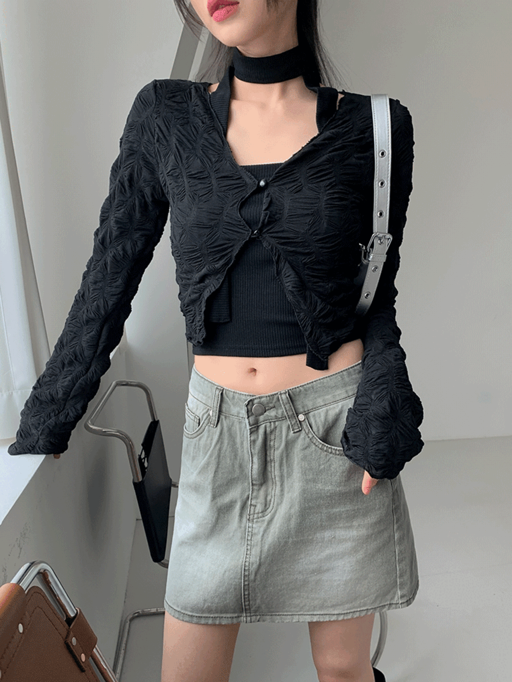 루핑 물결 레이스 크롭 가디건