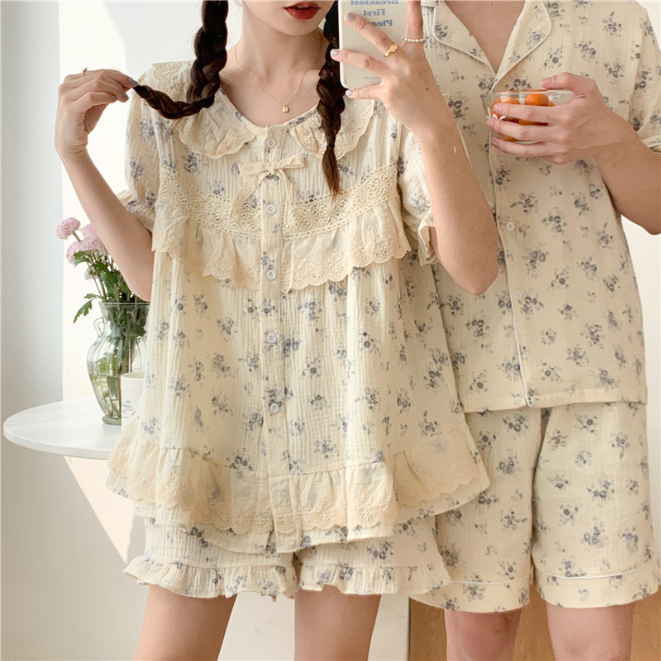 플라워 레이스 순면 요루면 커플잠옷 여름 반팔 신혼부부 파자마