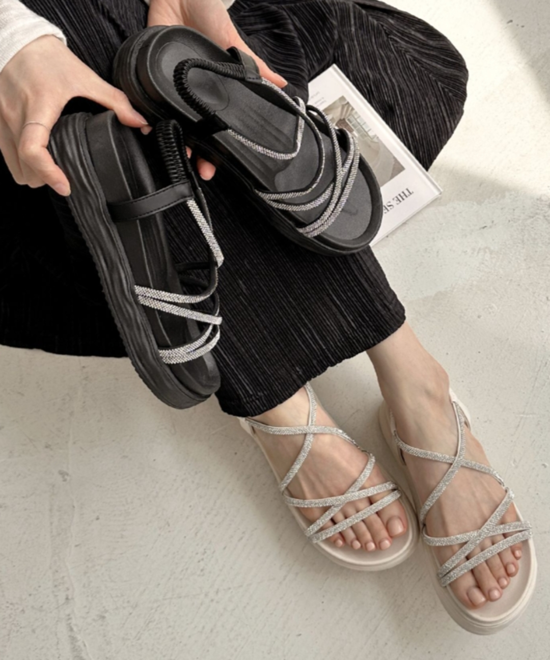 블링블링 큐빅 멀티스트랩 미들통굽 샌들힐4.5cm