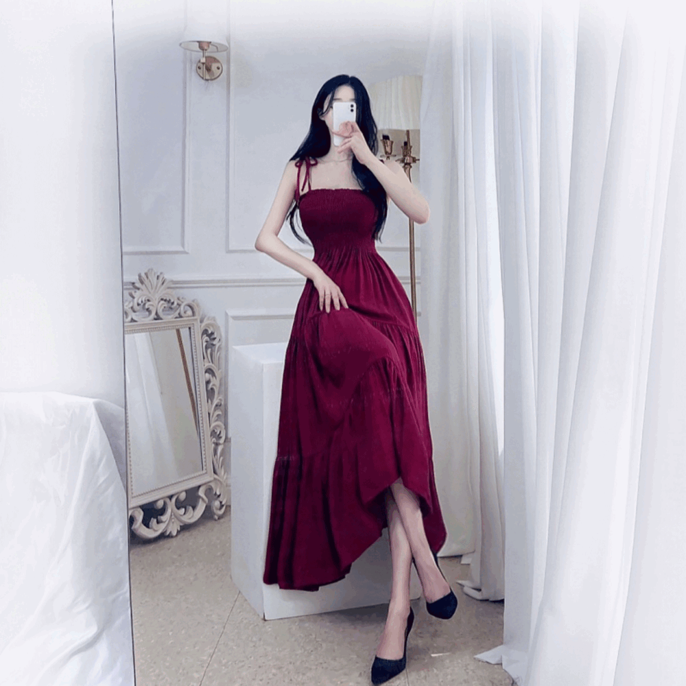 [빠른배송] 버건디 스모크 스퀘어넥 끈 나시 민소매 플레어 롱 원피스 (good quality 여름 여행 휴양지 휴가 비치 바캉스 원피스)