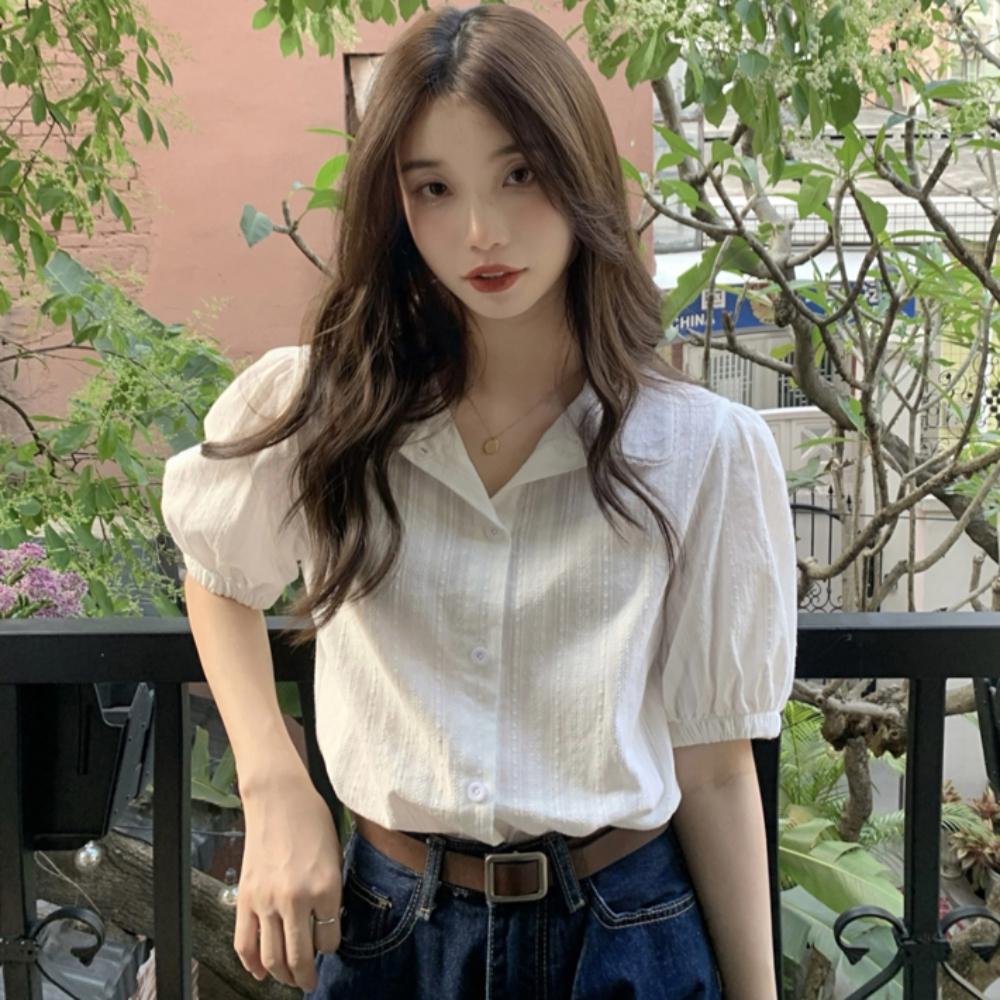 여성 여름 깔끔 코디 퍼프 카라 셔츠 블라우스 화이트