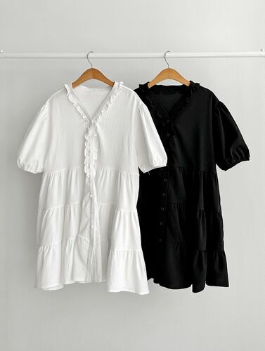 프릴 셔링 퍼프 5부 반팔 캉캉 셔츠 미니 원피스 2컬러