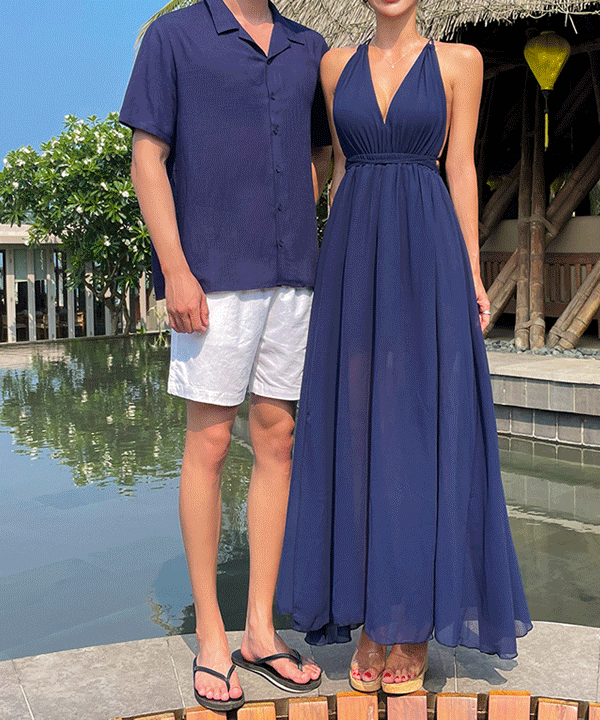 [MADE BY 비바럽]헤스티아 허니문 시밀러 커플룩[허니문/커플룩/신혼/여행/휴양지/바캉스/비치웨어/시밀러/네이비/쉬폰/롱/원피스/백리스/백크로스] OP19716F