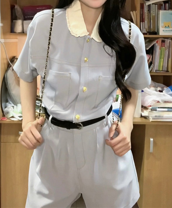 공항패션 공항룩 레이스 카라 반팔 허리벨트 여름 점프수트