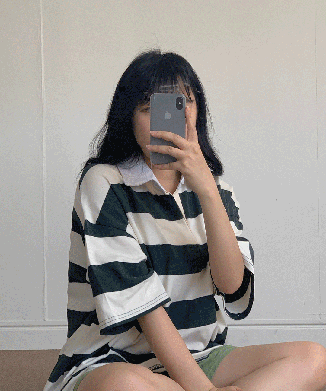 [1+1]데이 오버핏 스트라이프반팔티 오버핏반팔 커플룩 카라티