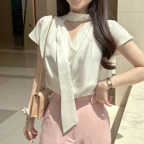 [페미닌무드] 전시회 오피스룩 반팔 타이 여름 블라우스