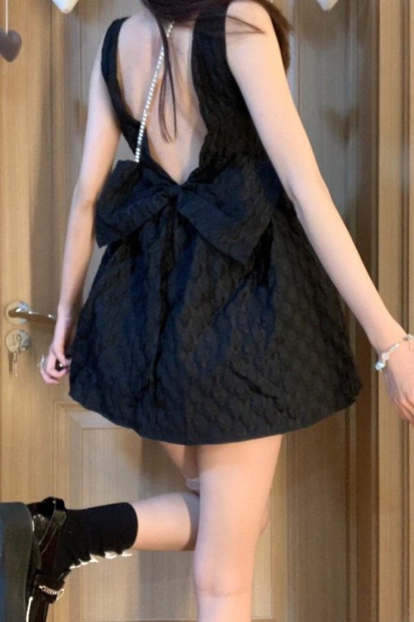 야그 엠보싱 백 오픈 리본 민소매 나시 미니 원피스