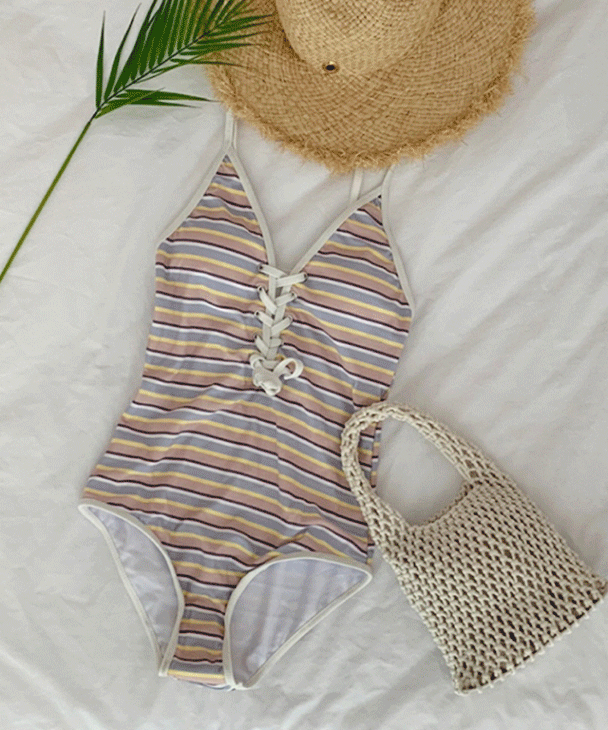 [귀여운 컬러감🍬] 트로피칼 브이넥 골지 액티브 스포티 스트라이프 줄무늬 모노키니 수영복 비키니