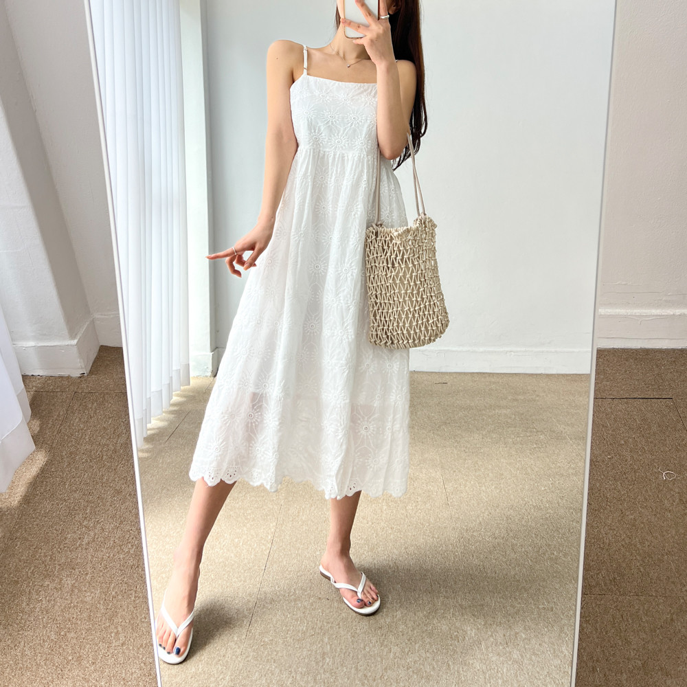 (무배 끈조절가능) 플라워 펀칭 자수 스퀘어넥 뷔스티에 나시 미디 원피스
