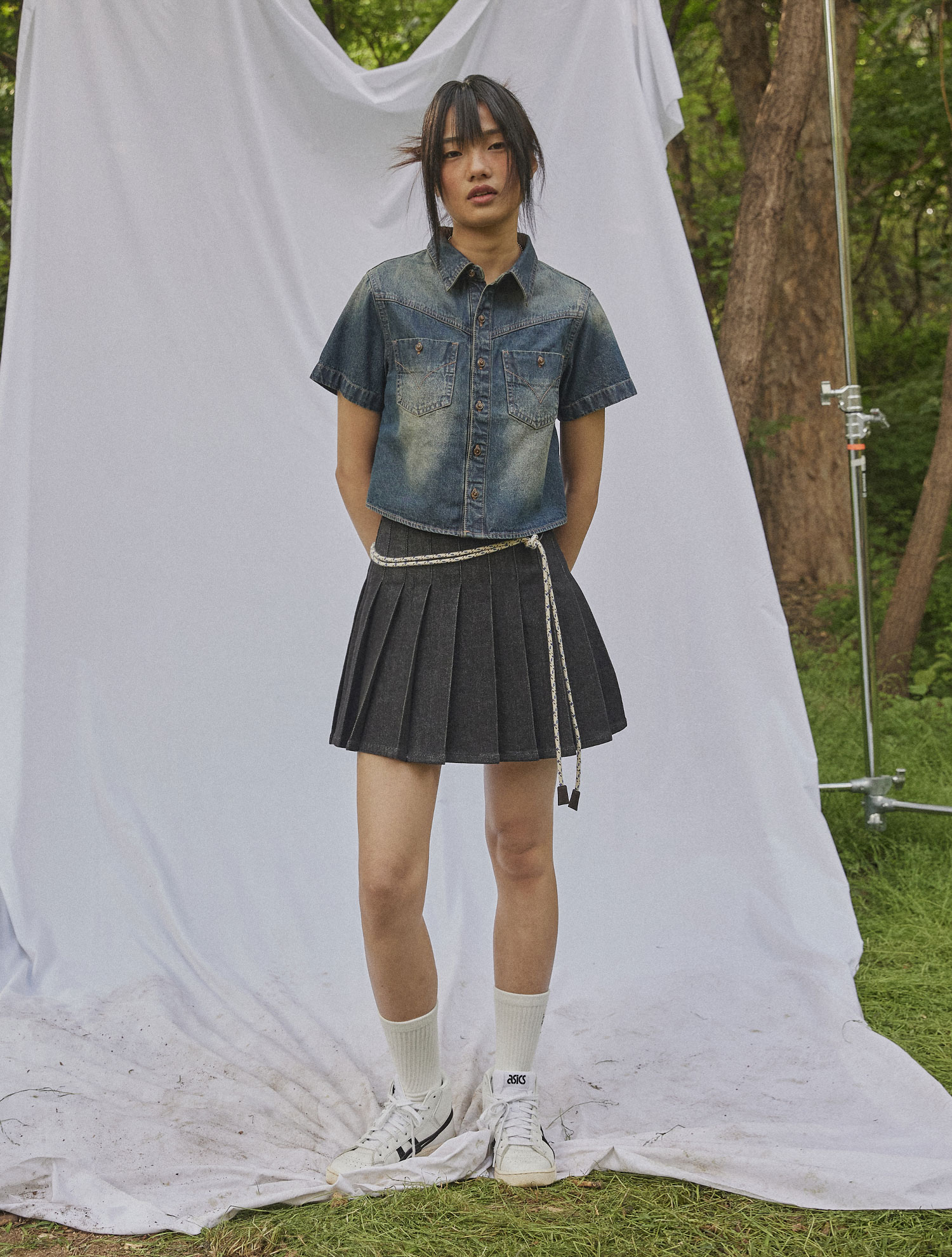 페머랄드 2801 더스티워시 미디움인디고 크롭 반팔셔츠