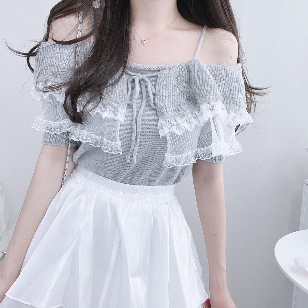 [오프숄더/페미닌] 리본 스트링 레이스 오프숄더 니트