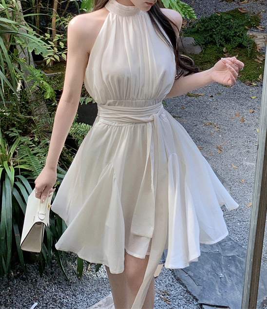 [썸머/휴가룩/여행룩]홀터넥 셔링 프릴 오프숄더 드레스