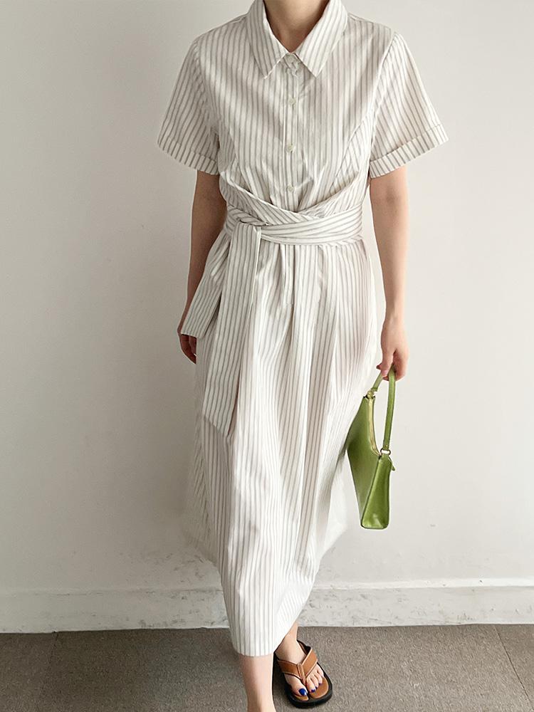 세이지 스트라이프 셔츠 롱원피스 / Wruf