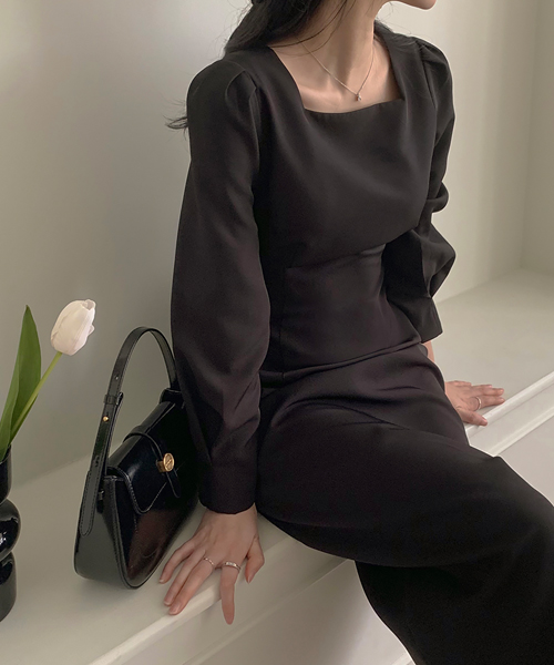 [단독][⭐3천장/셀프웨딩/브라이덜샤워/하객룩] MADE 클레어 스퀘어넥 핀턱 퍼프 허리끈 롱 H라인 원피스(반팔/긴팔)