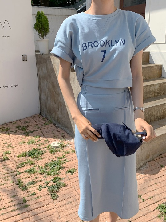 캐쥬얼 크롭 투피스 상하의 트레이닝 세트 맨투맨 롱스커트 하늘색 영문 영어 문구 레터링 츄리닝 여름 휴가 잠옷 원피스 티셔츠