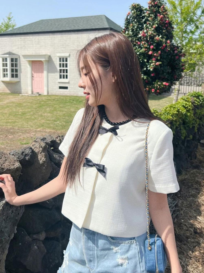 리본 버튼 반팔 숏자켓 (아이보리 블루)