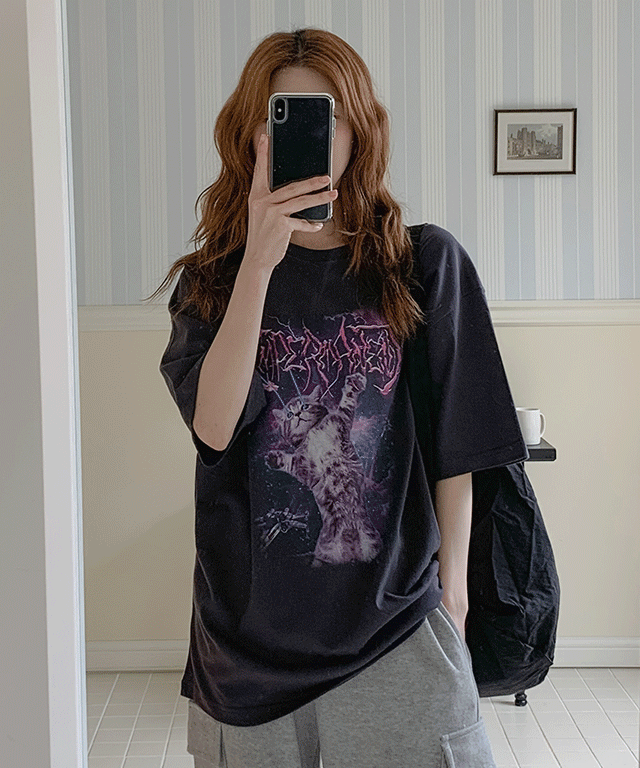 [남녀공용/유니크💜] 우주고양이 오버핏 반팔 티셔츠 - 3color