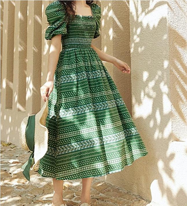 스모크 밴딩 반팔 롱 원피스 그린색 원피스 (오프숄더 가능)