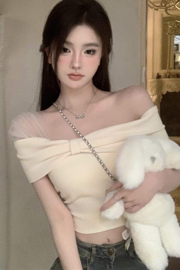 해브 오프숄더 리본 메쉬 스티치 크롭 니트 탑