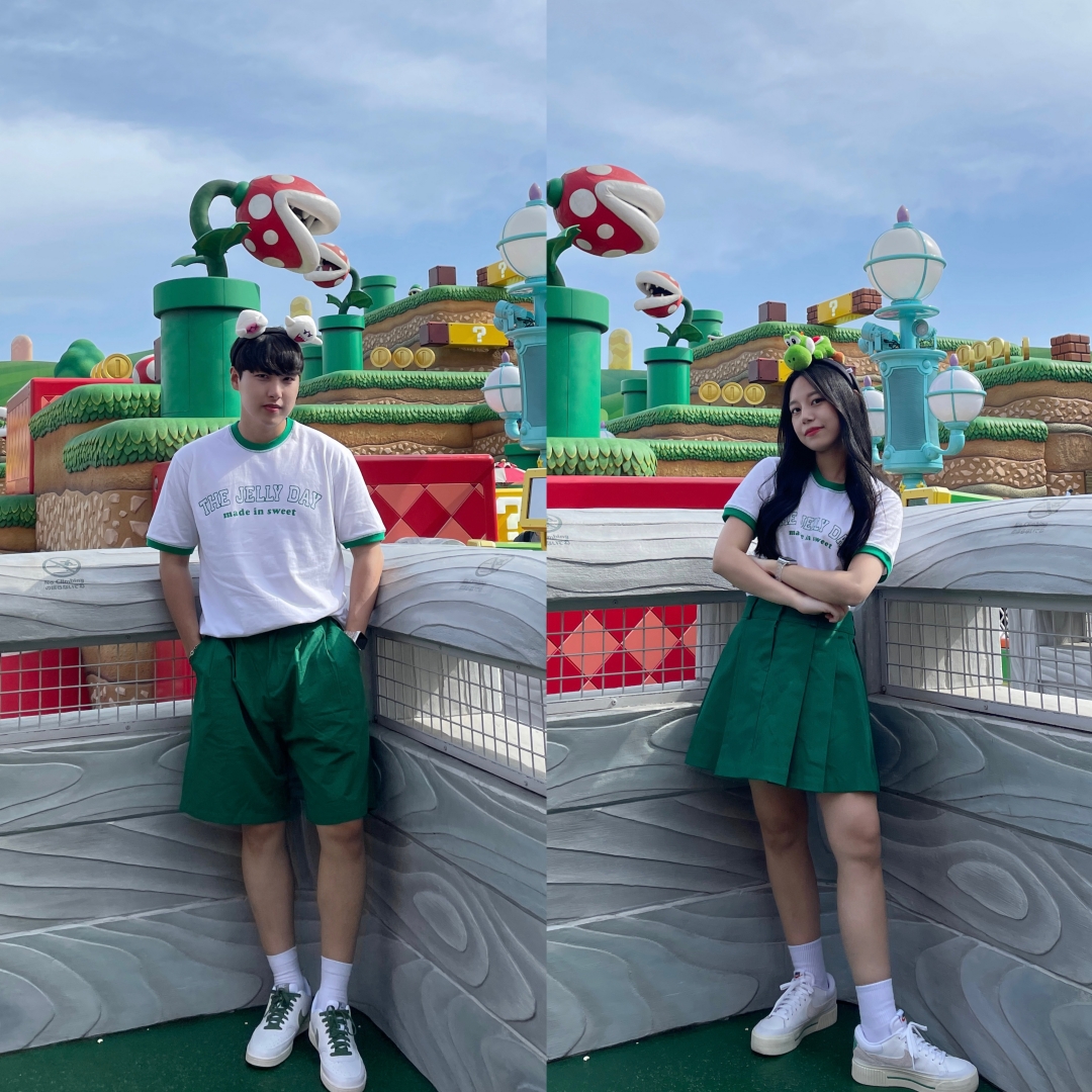 [놀이공원 강추🏰] 그린 젤리데이 크롭 배색 반팔 티셔츠 여름 바캉스 데이트 신혼여행 커플 시밀러룩