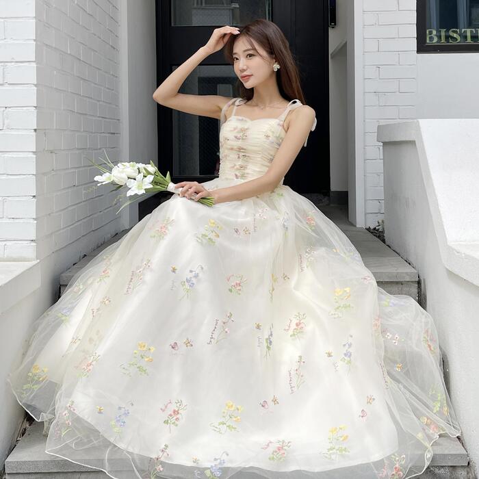 플라워 셀프웨딩 드레스 2color, 블랙 베이지 피로연 브라이덜샤워 스냅 촬영 꽃 자수 원피스