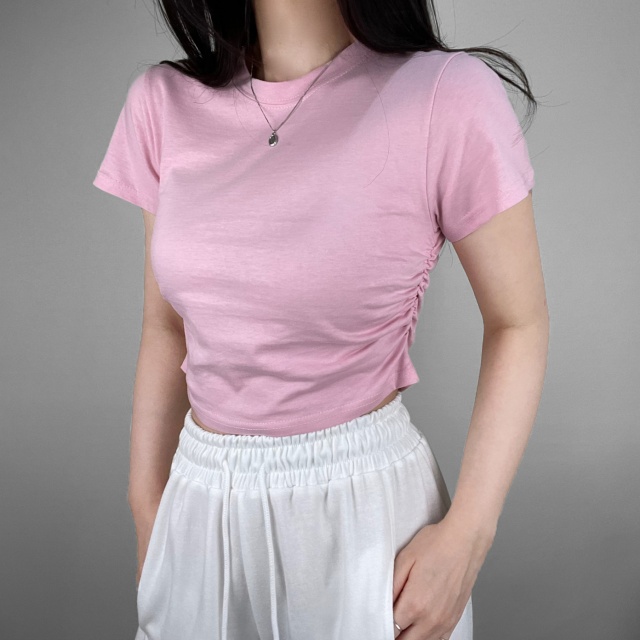 [다양한컬러/옆셔링] 옆셔링 크롭 라운드 반팔 티셔츠 셔링 하리보 무지