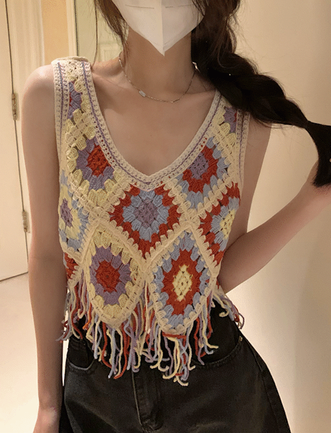 꽃 패턴 크로쉐 나시 민소매 자수 브이넥 아가일 여름 조끼니트 베스트 테슬 숏나시 보헤미안 데이트룩 레이어드 새내기 여름코디 귀여운 배색니트