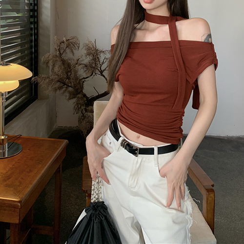 [레드브라운 당일출고]밀라 하객룩 오프숄더 반팔 티셔츠 스카프 세트 투웨이