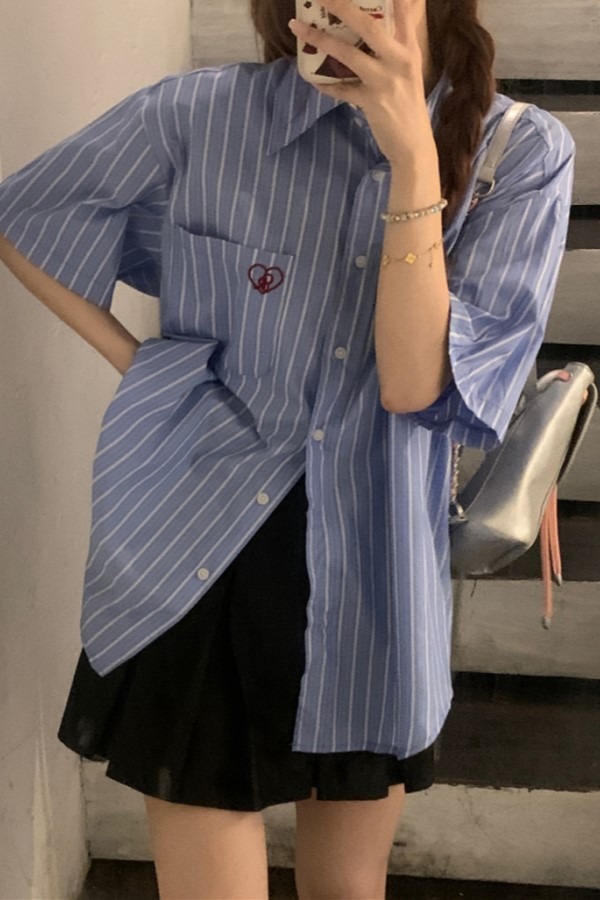리베 블루 스트라이프 하트 자수 반팔 루즈핏 셔츠
