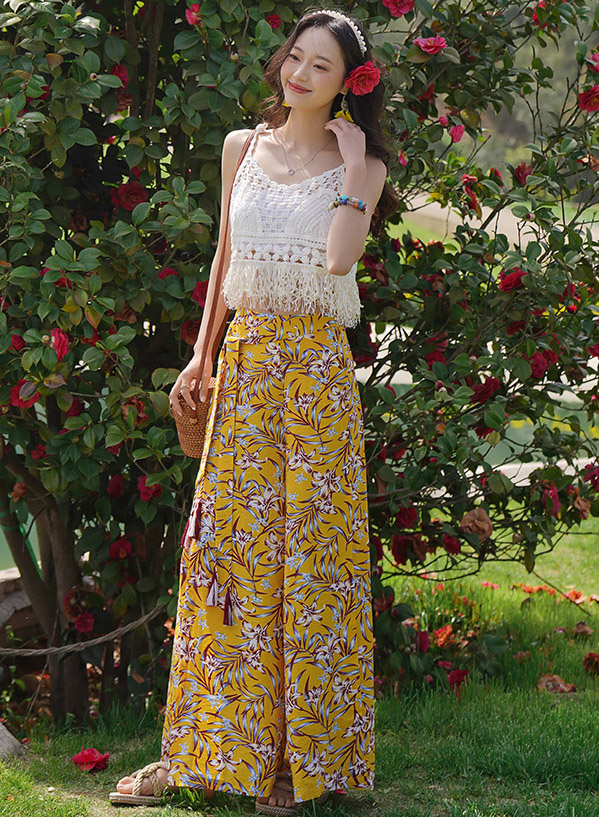보헤미안 그물 나시탑+프린팅 와이드 팬츠 세트