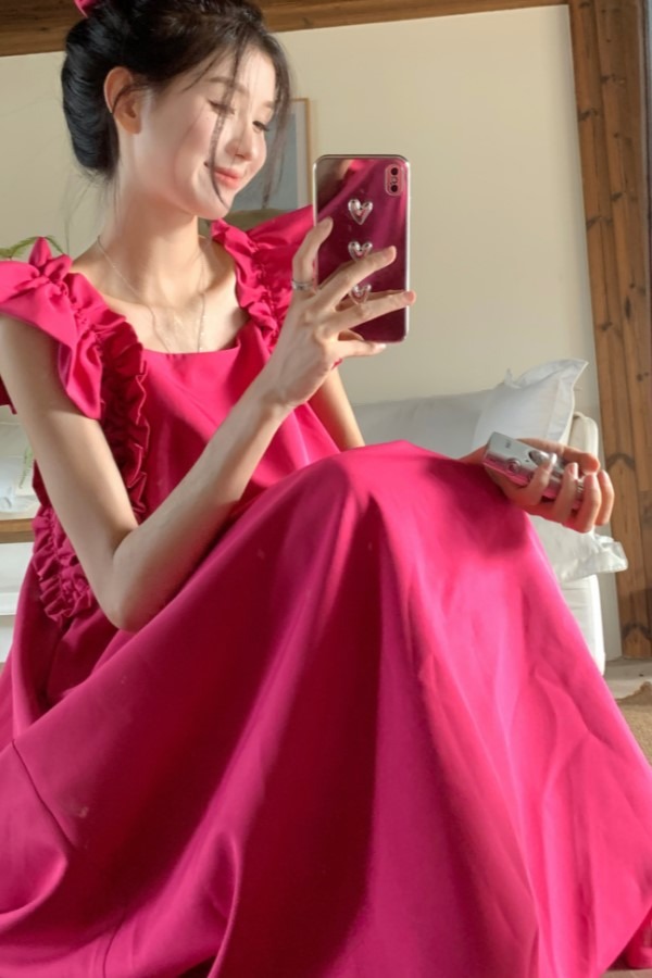 노라 레드 핑크 스퀘어넥 프릴 민소매 나시 롱 원피스