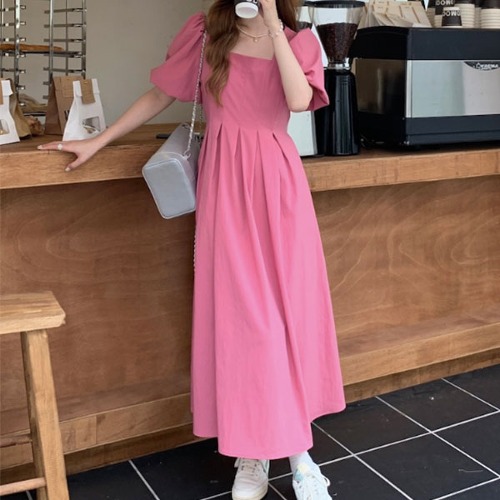스퀘어넥 퍼프소매 주름 플리츠 허리 슬리밍 원피스 267858