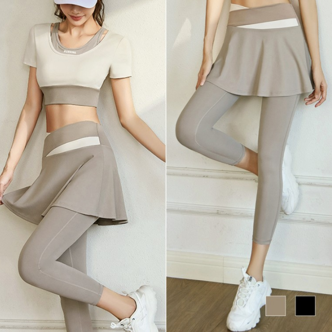 [2컬러/4사이즈] 레이어드세트 나시레이어드 반팔 레깅스 치마레깅스 요가복 필라테스복 운동복 피트니스 여성치마레깅스 여자치마레깅스 여성반팔 여성나시탑 운동복 예쁜운동복 발레코어
