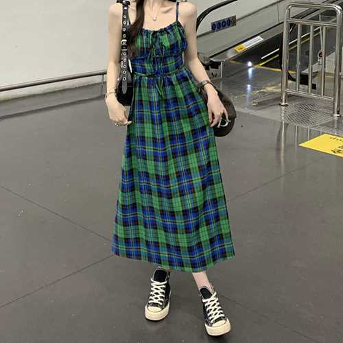 그린 블루 체크 홀리데이 하이웨스트 끈나시 롱 원피스 J02