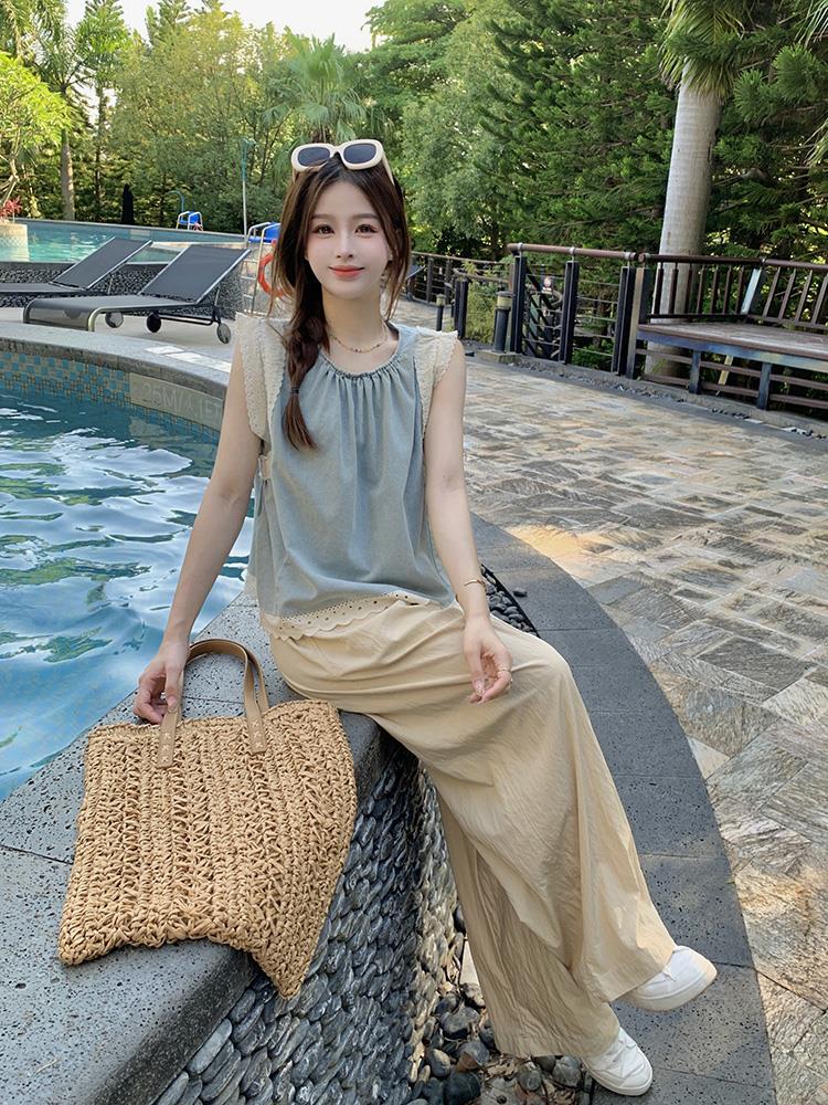 [ 쿨여름 상하세트 ] SET 데님 나시 상의 탑 민소매 이너 통팬츠 플리츠 바지 긴바지 와이드 루즈핏 레이스 주름 SETUP 셋업 여행 비치 바캉스룩 휴가 리조트룩 휴양지옷 동남아 봄옷 30대 40대 여성 여자 레이디