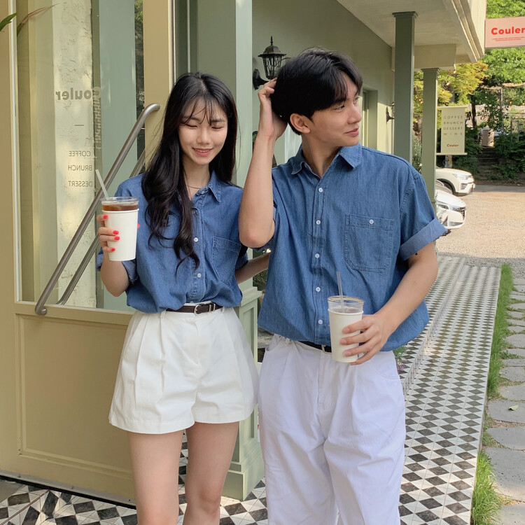 여름 커플시밀러룩 바캉스 제주도 신혼여행 중청 데님 반팔 셔츠 남방