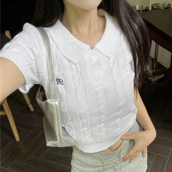 반버튼 폴로 카라 크롭 꽈배기 여름 니트 티셔츠 시원 쿨 캐주얼 편한 데이트