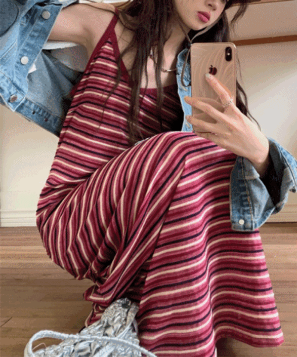 [빈티지/여행룩!] 슬림 스트라이프 브이넥 나시 롱원피스