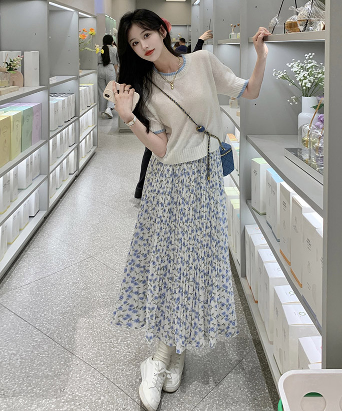 여름 니트 반팔/꽃무늬 주름 롱 스커트 코디세트