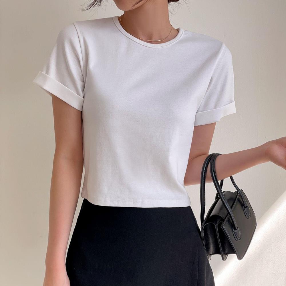 여자 썸머 베이직 라운드 롤업 반팔티 크롭 티셔츠