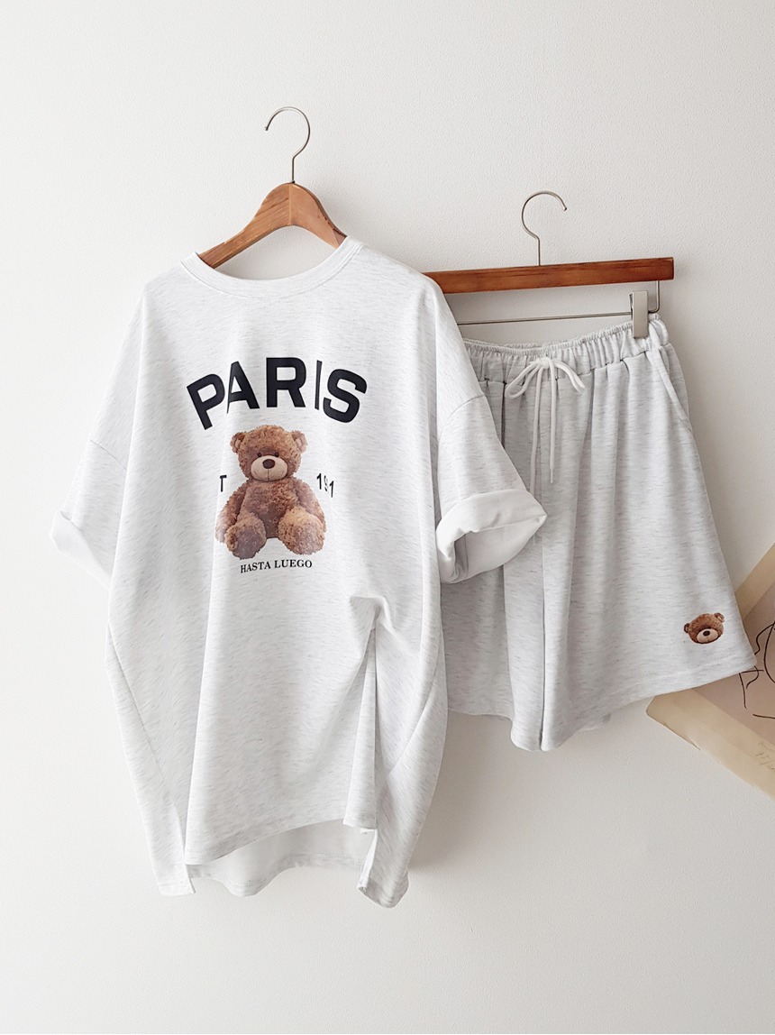 귀여워! 곰돌이 베어 프린트 빅사이즈 옆트임 반팔 롱 티셔츠 밴딩 반바지 투피스 썸머 홈웨어 트레이닝복 여름휴가 바캉스 추리닝 세트