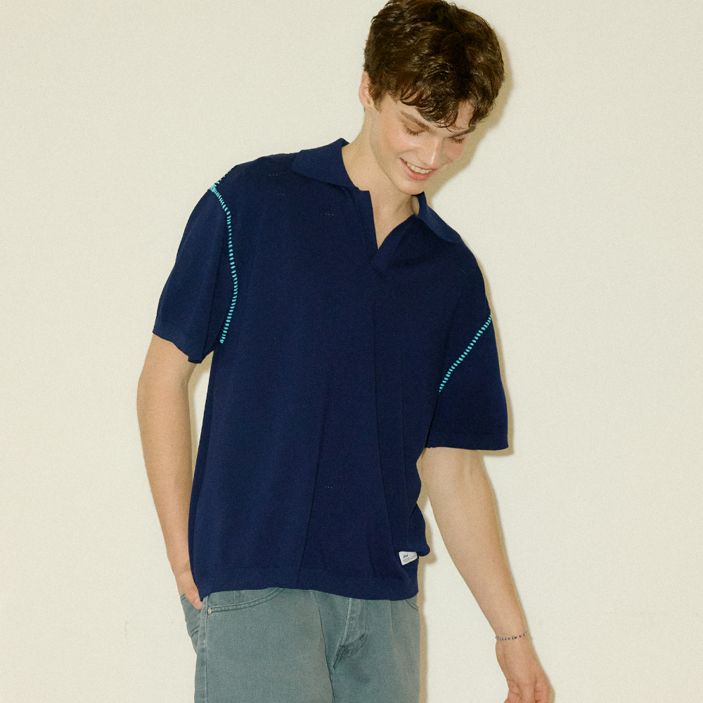 핸드메이드 스티치 오픈 카라 니트(NAVY)
